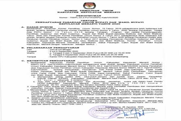 PENGUMUMAN TENTANG PENDAFTARAN PASANGAN CALON BUPATI DAN WAKIL BUPATI KEPULAUAN MERANTI TAHUN 2020